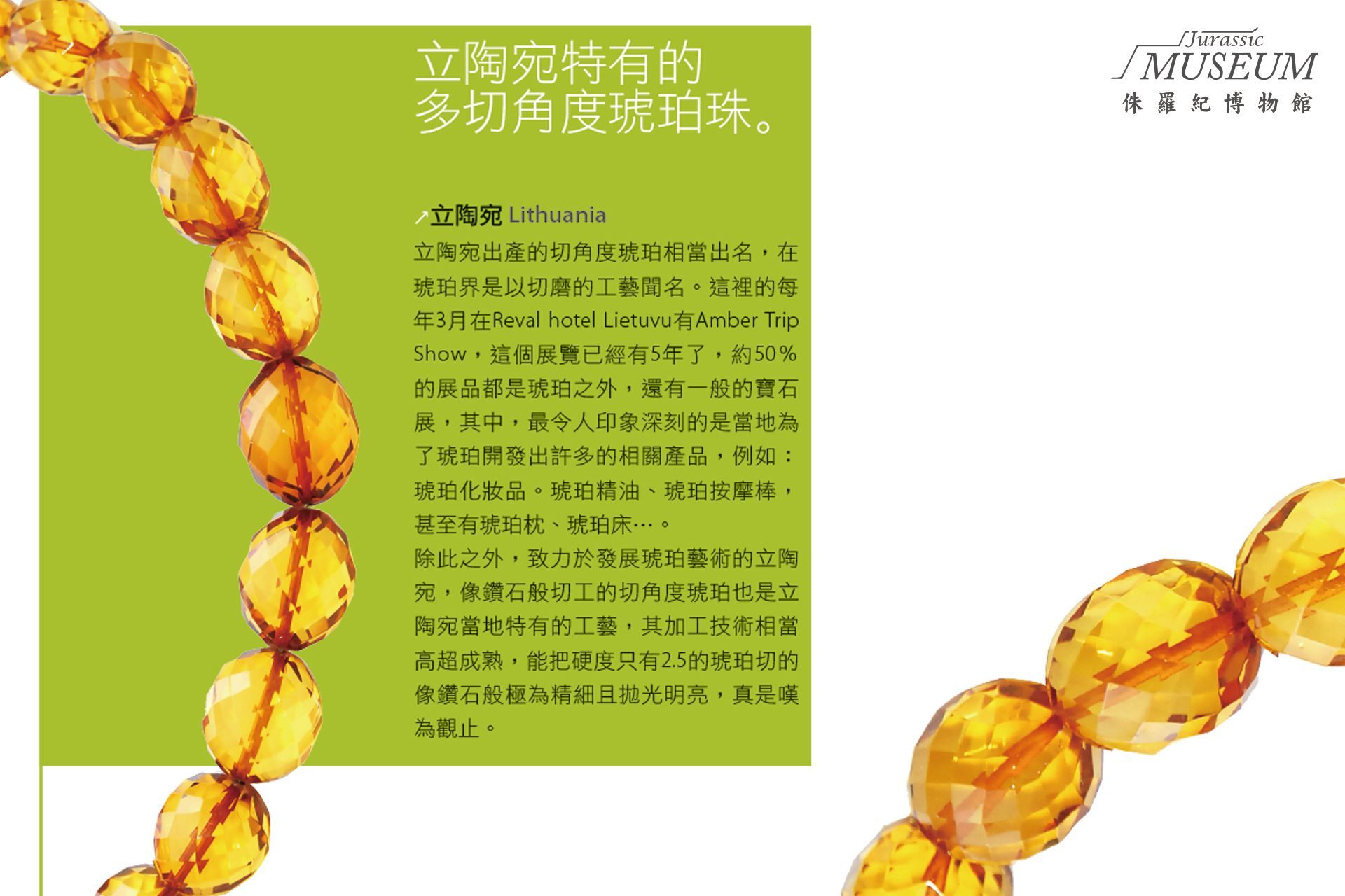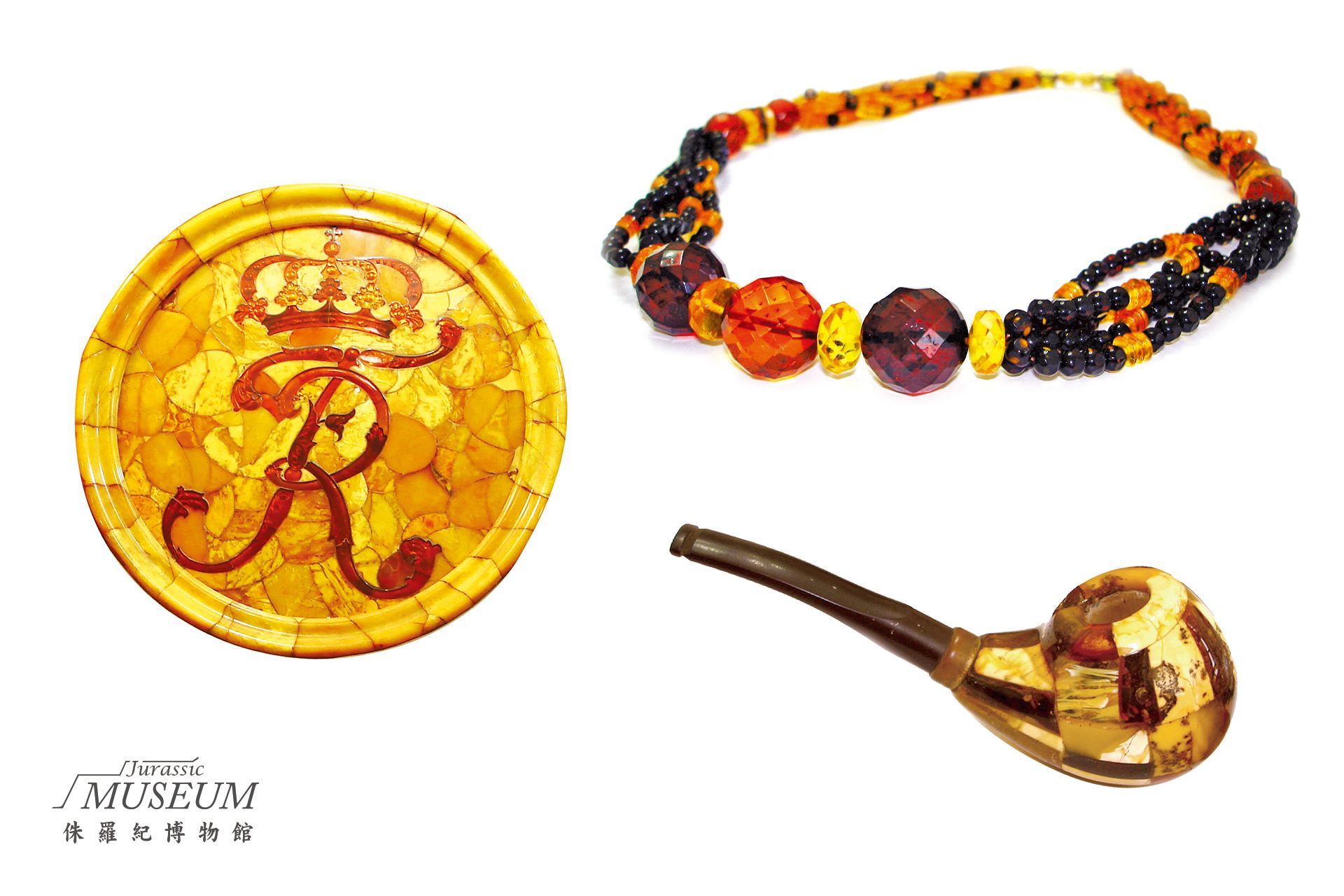 (右上)血珀項鍊。一般市場上的血珀大部分來自波羅的海,少部分來自其他地區