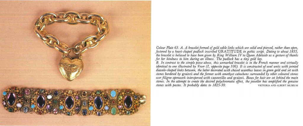 1830起,誇張的服裝,如低胸、束腰服裝正需要裝飾胸口珠寶,這些服裝通常繡上細小裝飾,釘上象徵性的徽章。愛心造型的珠寶、鑲嵌滿各種寶石的華麗手鐲、巨型胸墜(Bodice & Breast Ornaments),透漏贈送者與配戴者濃厚的情感,愛情、友誼、慾望等各種秘密,深藏在當時的珠寶工藝。